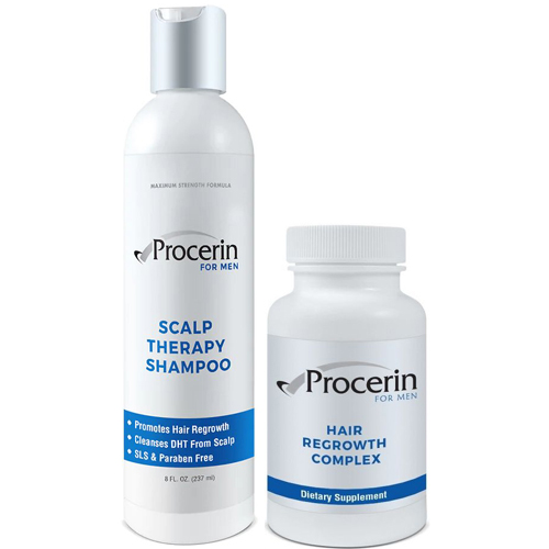 Лінійка процерин (procerin) складається з вітамінів та шампуню. Вітаміни procerin розроблені спеціально для чоловіків, у яких випадає волосся за андрогенетичним типом (класичне чоловіче облисіння). Застосування таблеток процерин блокує 5 альфа-редуктазу, що призводить до зниження рівня ДГТ у волосяних фолікулах. Цей препарат містить у своєму складі вітаміни, які потрібні волоссю для повноцінного росту.